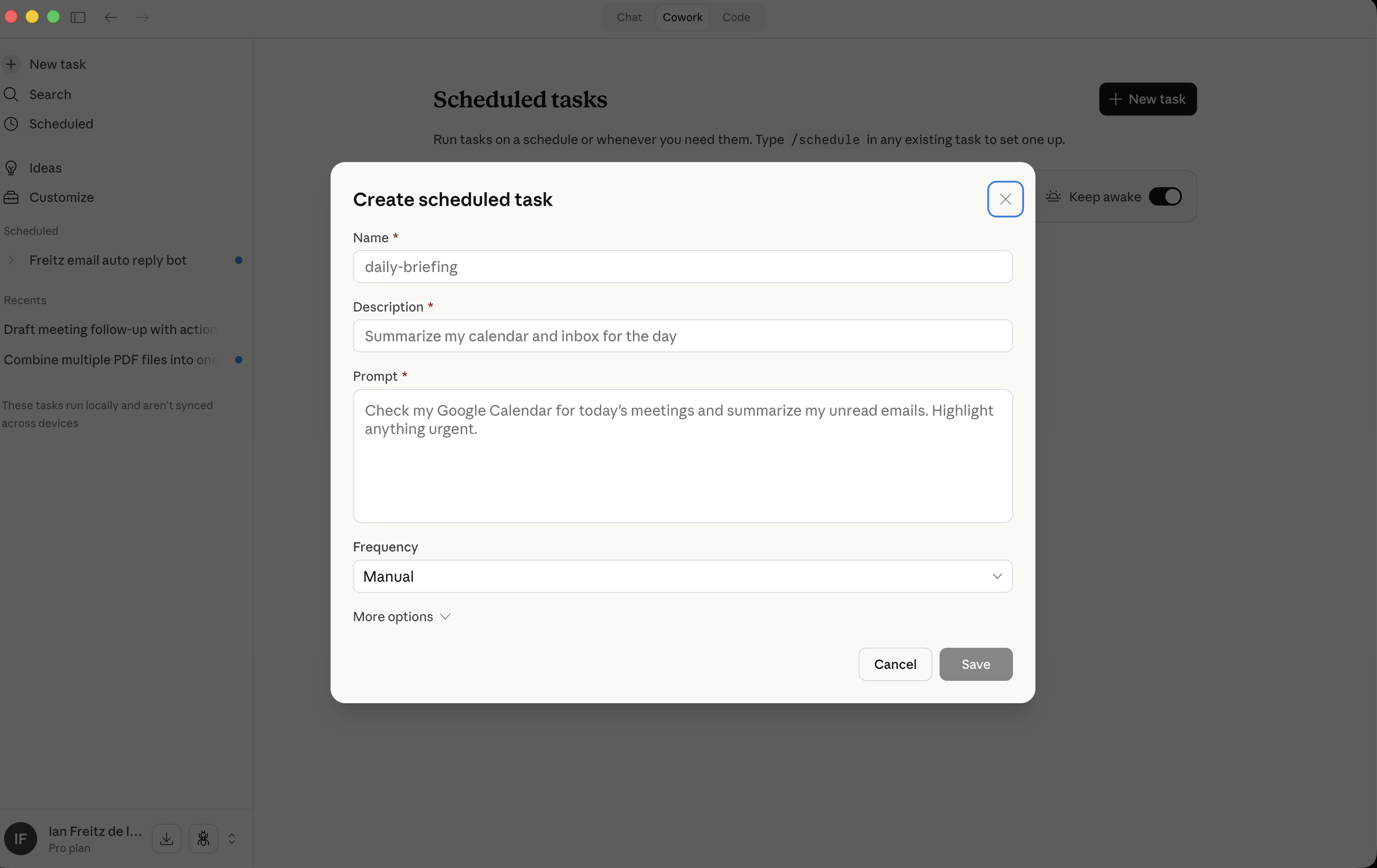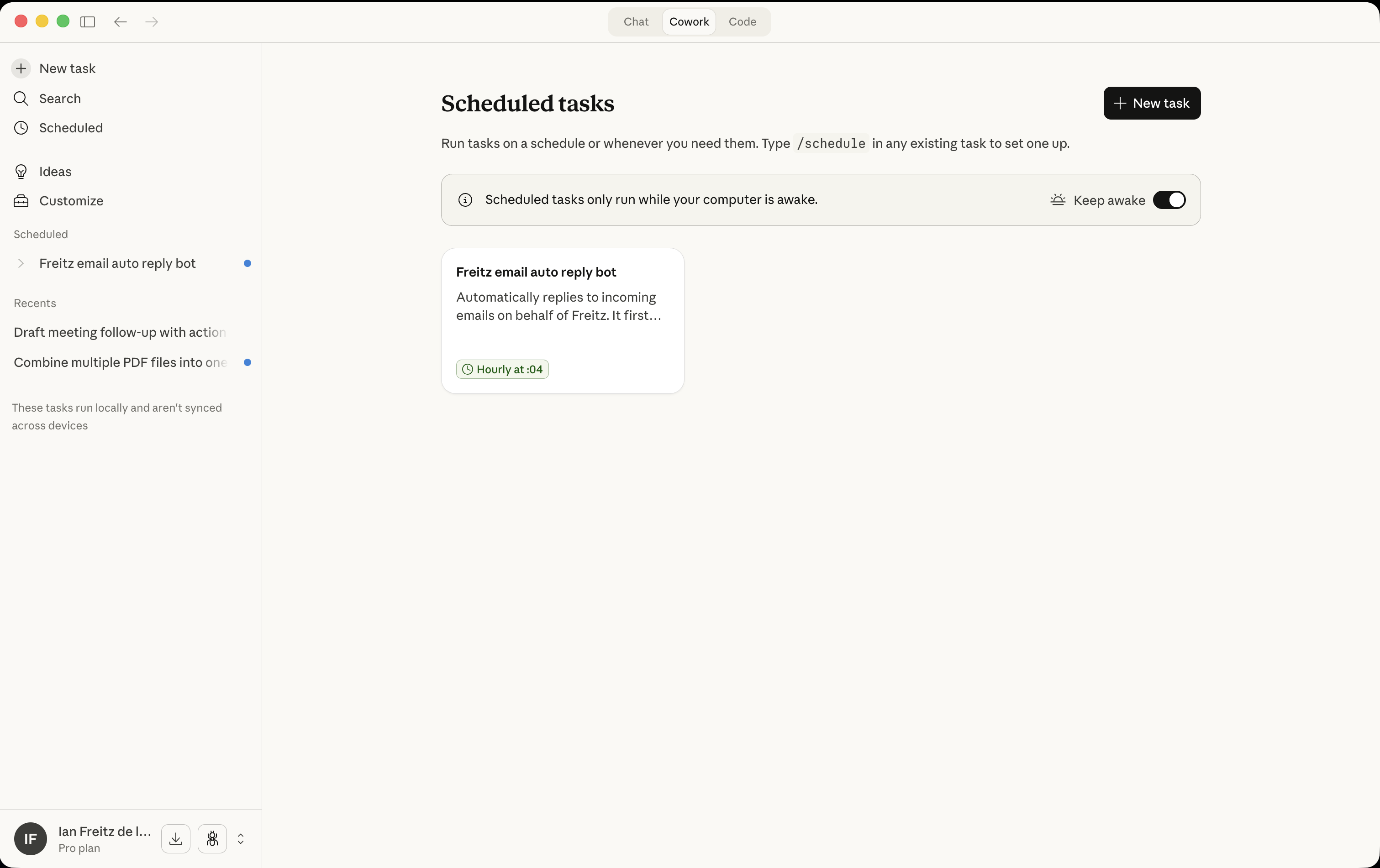 This feature allows me to run tasks on a schedule, but there's still one limitation: it only runs the scheduled tasks when your computer is awake. Hopefully, someday it can run tasks in the background even when your computer is not awake.