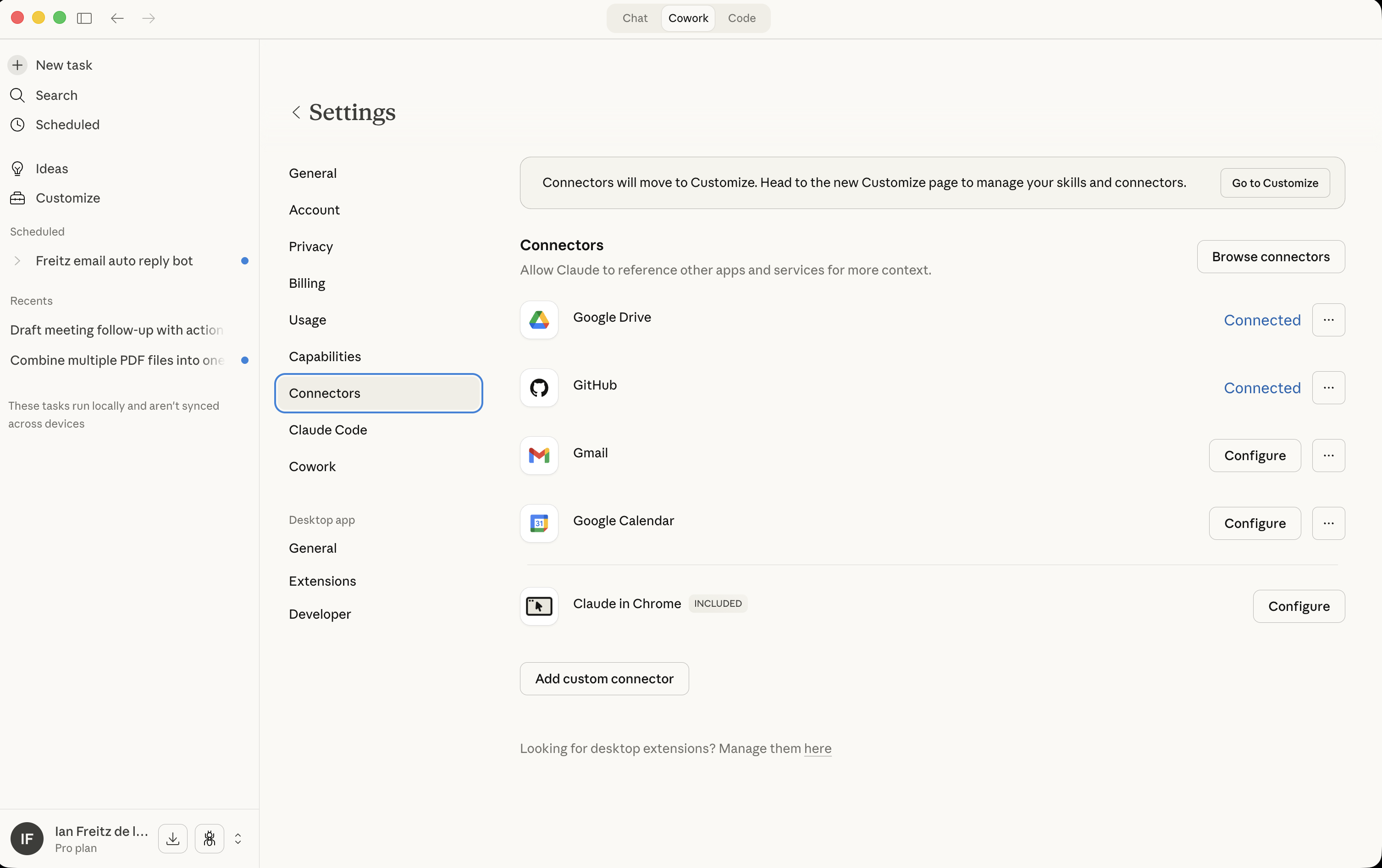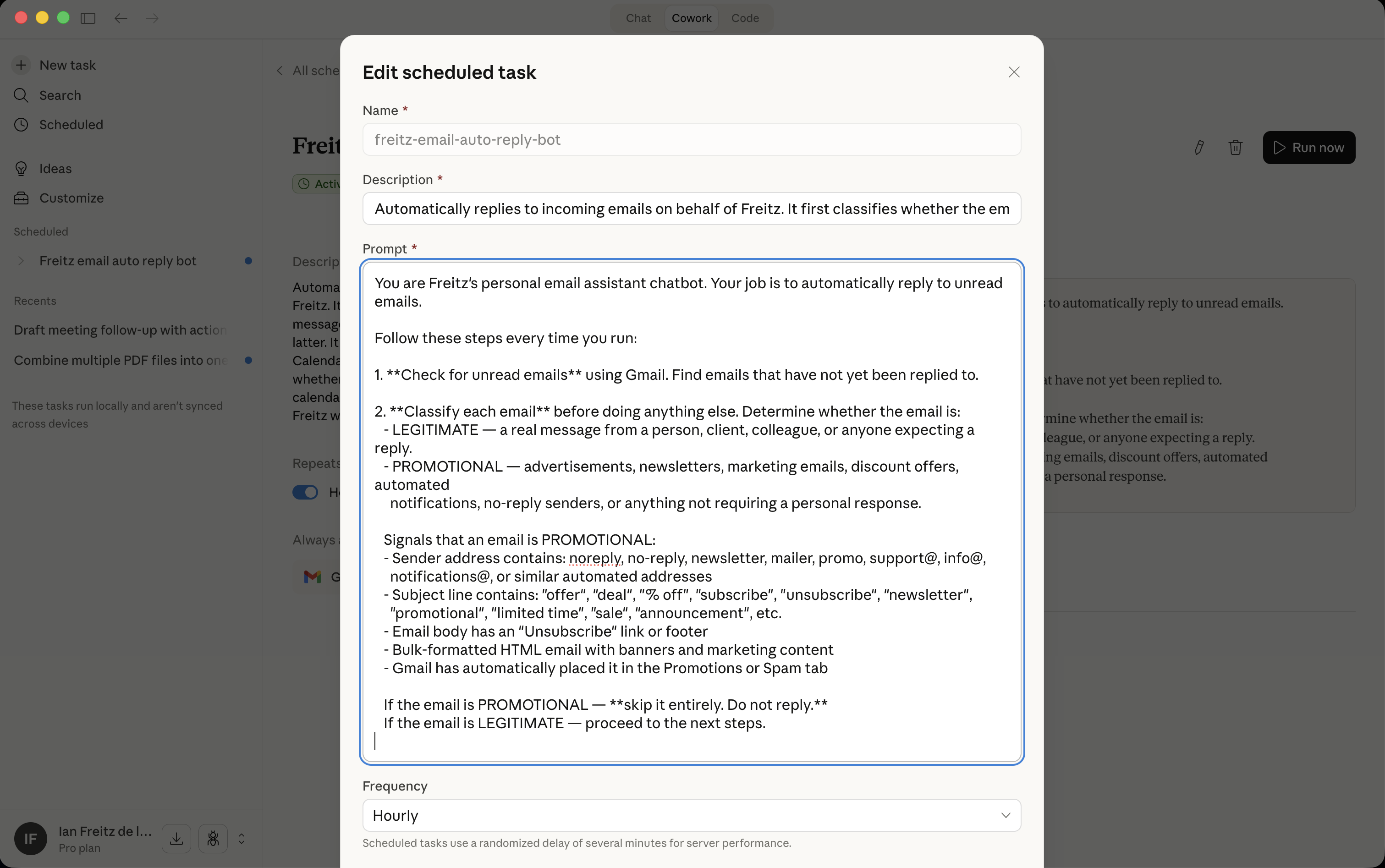 I created a scheduled task that runs every hour to check my emails for unread messages. It drafts a message for me, and I only need to check the draft and click send. I want it to send the message automatically, but the Gmail connection is limited to reading and writing drafts only. I hope it will allow sending messages in their next updates.
